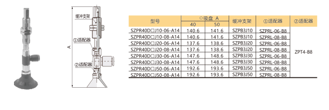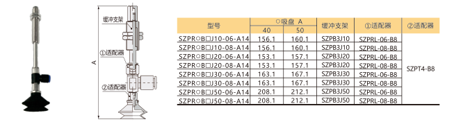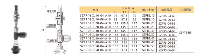 訂貨舉例:SZPT系列帶緩沖型真空吸盤,吸盤直徑?10,平行吸盤,丁晴橡膠,不可回轉型,緩沖行程20,真空連接口:外螺紋M5×0.8;安裝連接螺紋直徑M10X1.0。其訂購碼為:SZPT10UNK20-B5-A10