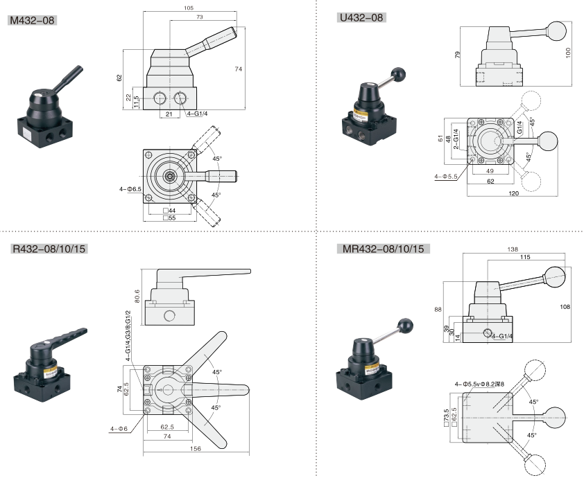 訂貨舉例:R系列手轉(zhuǎn)閥,三位四通,2系列閥體,1/4"接管口徑,G牙,