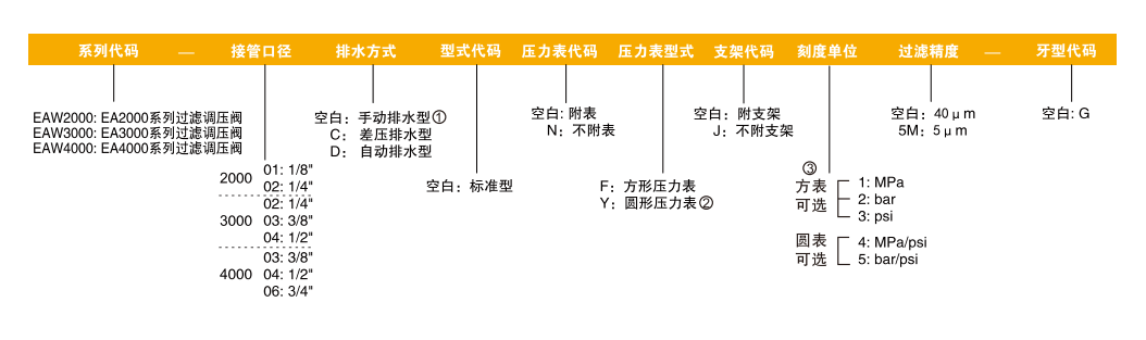 訂貨舉例:EA3000系列過濾調壓閥,接管口徑1/2",差壓排水型,附表,方形壓力表,附支架,刻度單位為MPa,過濾精度為5um,G牙,其ERP編為:EAW3000-04CF15M