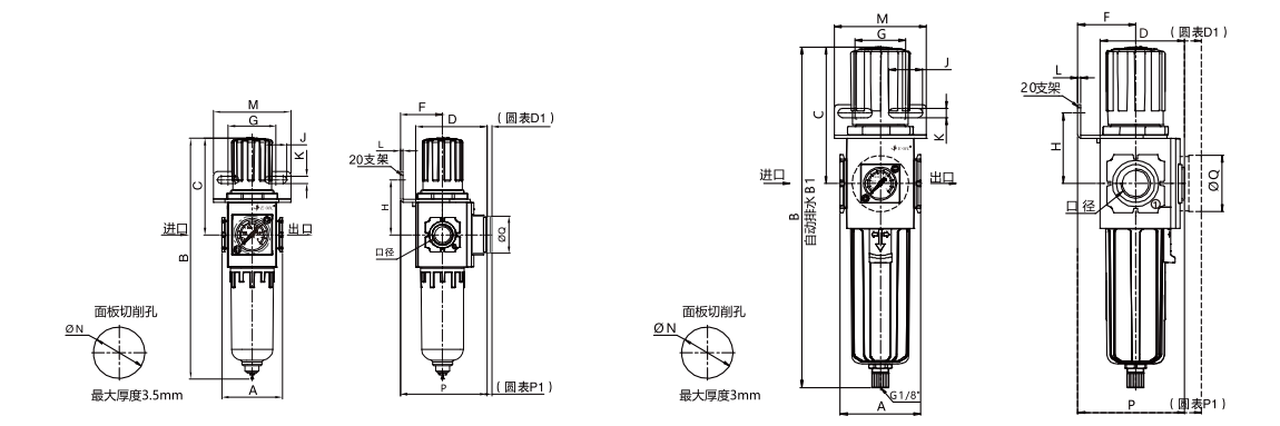 注:1)2000系列只有手動排水型,方形壓力表;