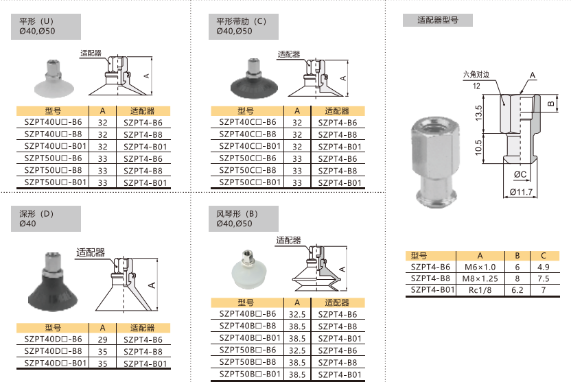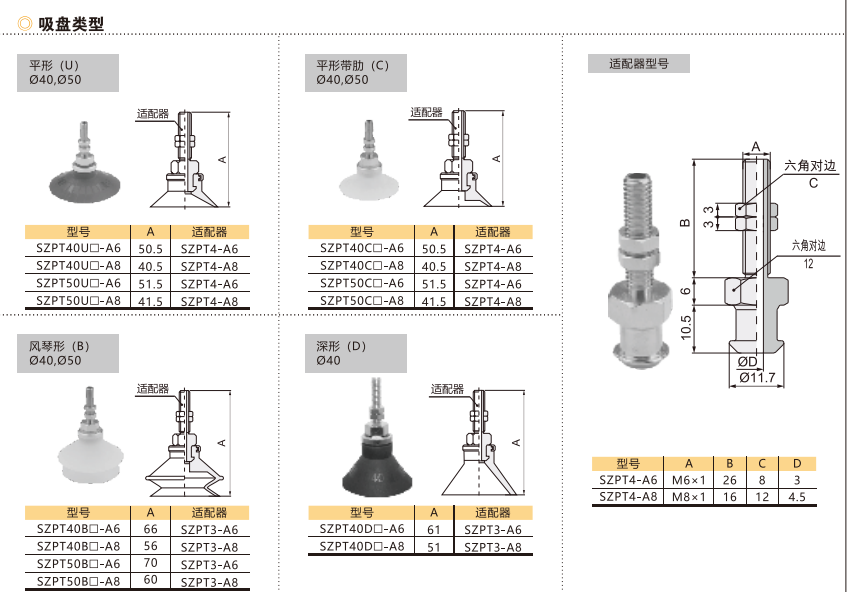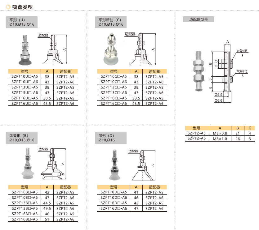 訂貨舉例:SZPT系列不帶緩沖真空吸盤,吸盤直徑?10,平行吸盤,丁晴橡膠;真空口連接:外螺紋,螺紋直徑M5×0.8。其訂購碼為:SZPT10UN-A5
