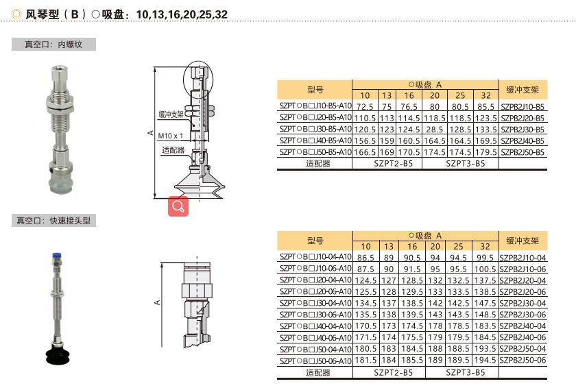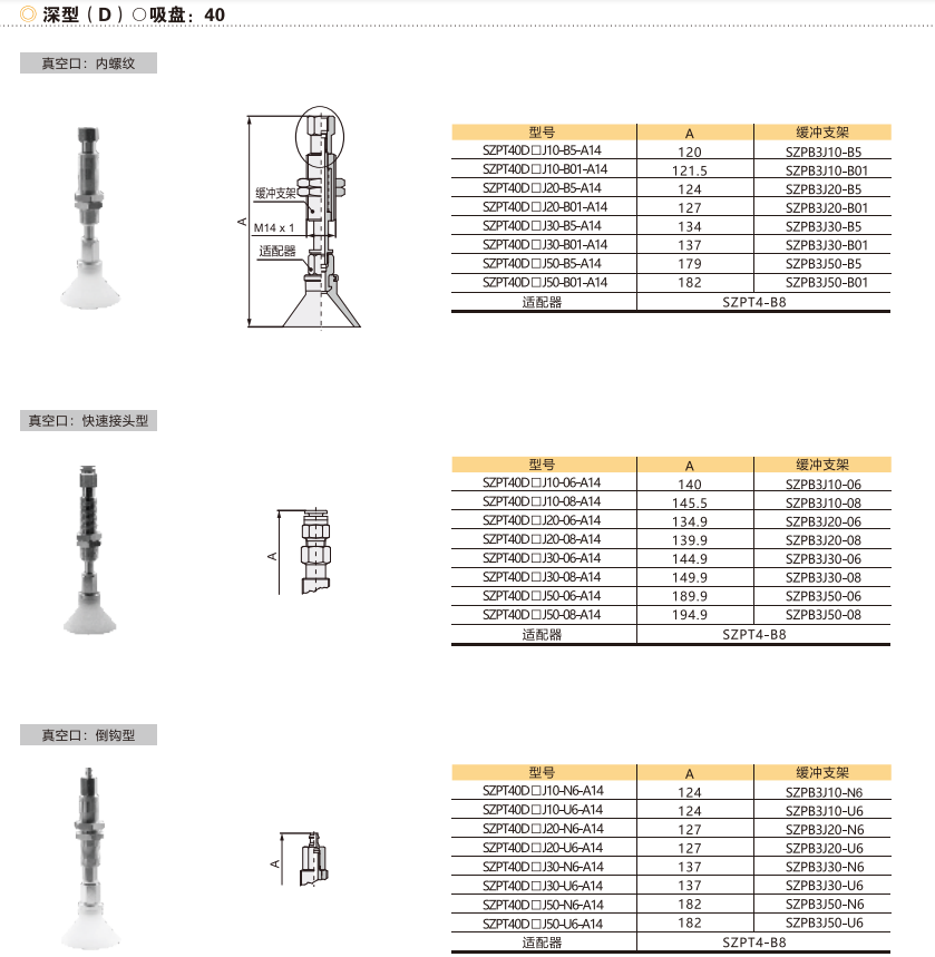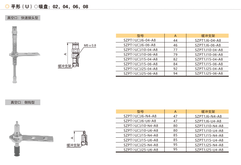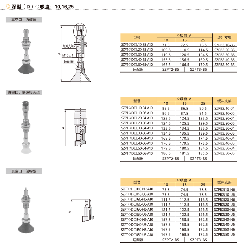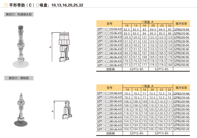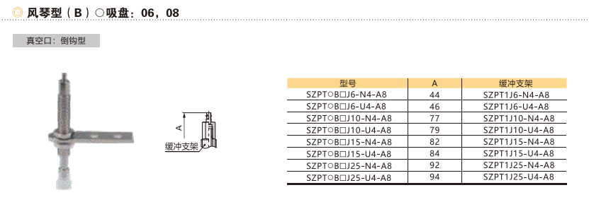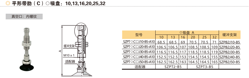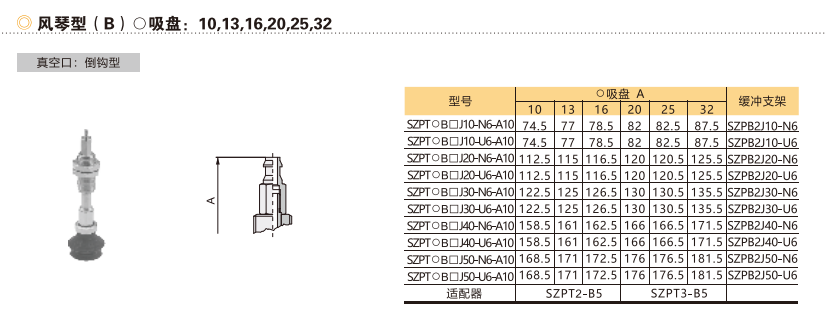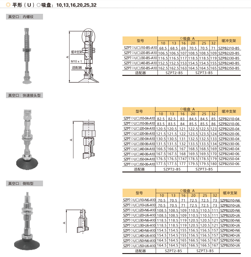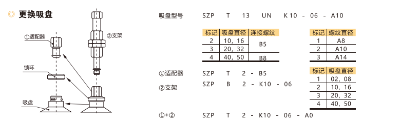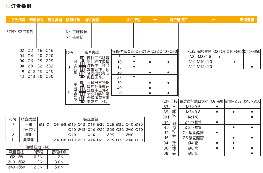 訂貨舉例:SZPT系列帶緩沖型真空吸盤,吸盤直徑?10,平行吸盤,丁晴橡膠,不可回轉型,緩沖行程20,真空連接口:外螺紋M5×0.8;安裝連接螺紋直徑M10X1.0。其訂購碼為:SZPT10UNK20-B5-A10