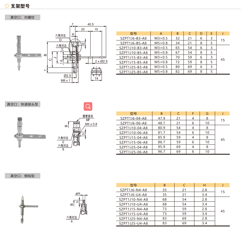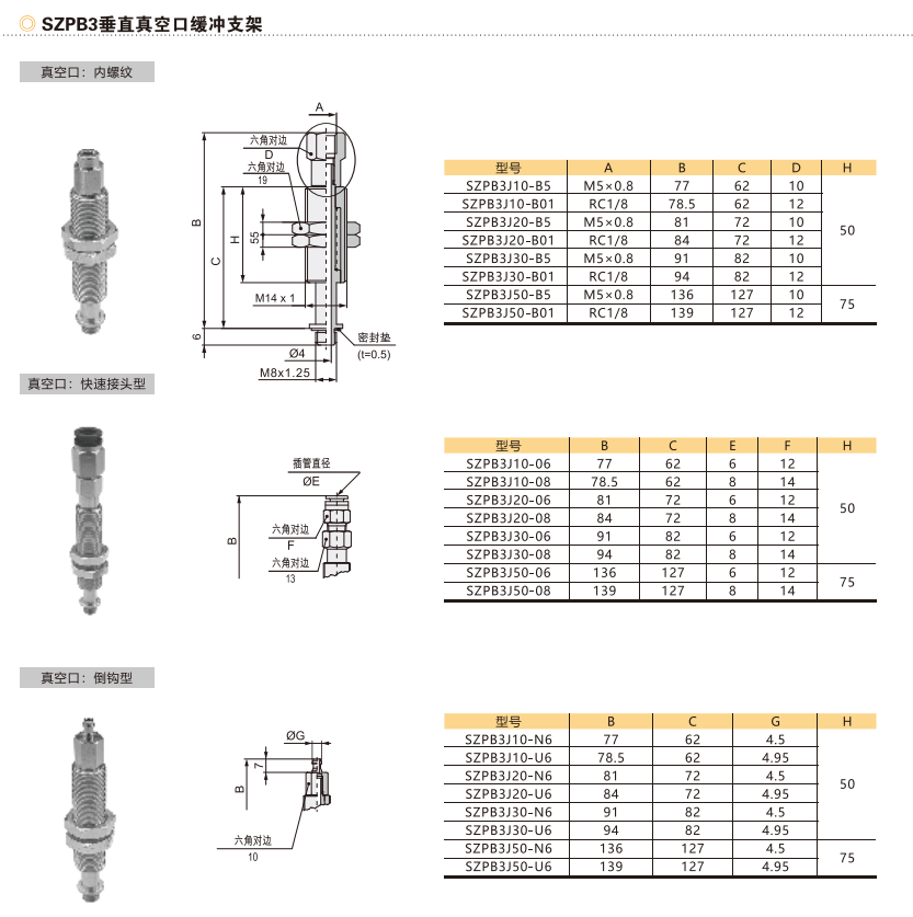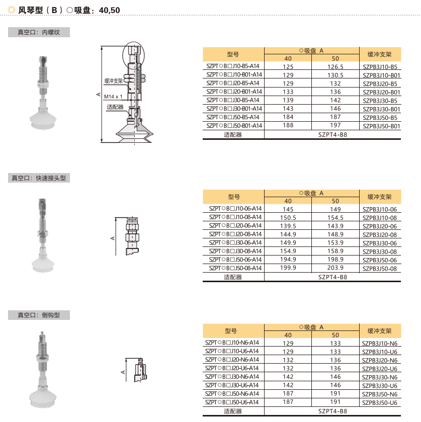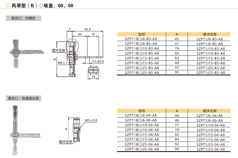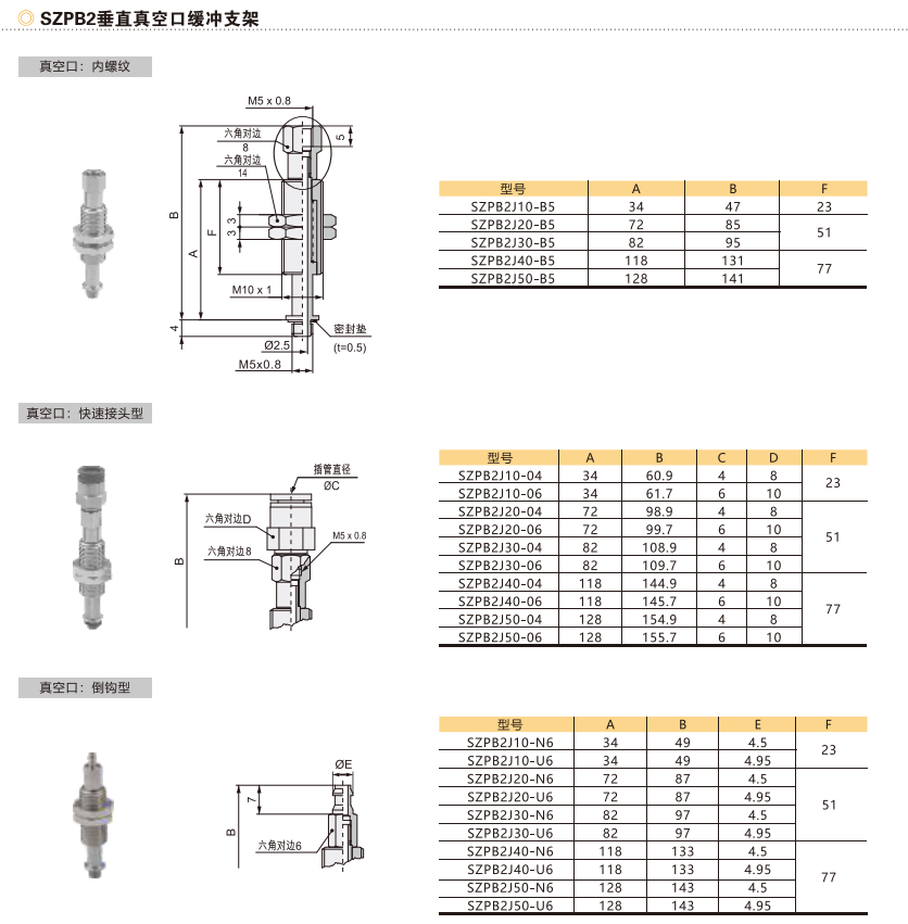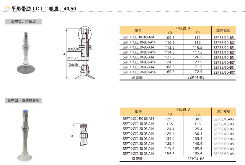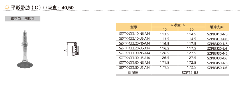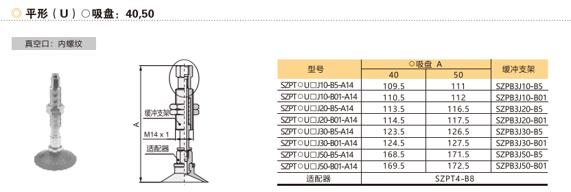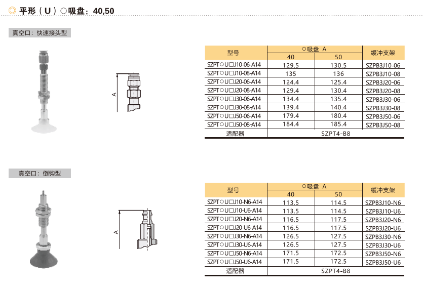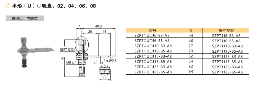 訂貨舉例:SZPT系列帶緩沖型真空吸盤,吸盤直徑?10,平行吸盤,丁晴橡膠,不可回轉型,緩沖行程20,真空連接口:外螺紋M5×0.8;安裝連接螺紋直徑M10X1.0。其訂購碼為:SZPT10UNK20-B5-A10