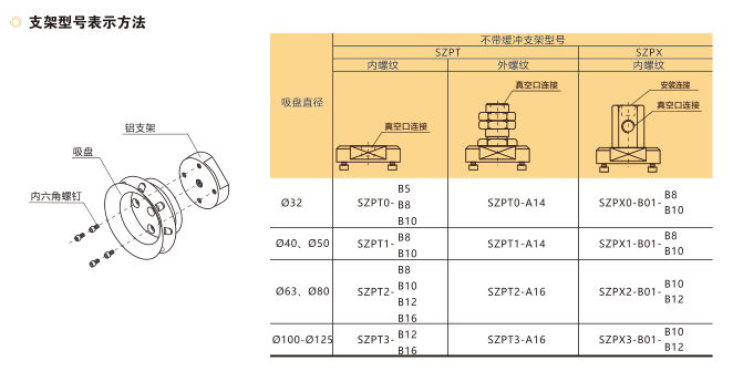 訂貨舉例:SZP系列重載型不帶緩沖真空吸盤,垂直真空口,吸盤直徑?40,重載型,丁晴橡膠,真空連接口:Rc1/8;安裝連接方式:外螺紋,螺紋直徑M14×1。其訂購碼為:SZPT40HN-B01-A14