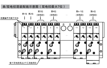 ⒉.不同規格閥混裝時:SR系列閥組,1系列,如右圖所示由第1、2位為二位五通單電控電磁閥RV5211,第3、4、5、6位為2個二位五通雙電控電磁閥SR5212,第7、8位為1個三位五通中封型雙電控電磁閥SR5312C,接管口徑為1/8,電壓為DC24V,附DIN導軌卡扣及1米DIN導軌,G牙。其ERP編碼為:S1R-2S2DC-06E4-D。