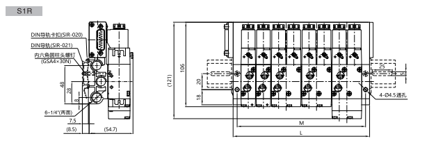 1.同規格閥時:SR系列閥組,1系列,6個二位五通單電控電磁閥RV5211,工作口接管口徑為1/8,工作電壓DC24V,無附件,G牙。其ERP編碼為:S1R-6S-06E4。