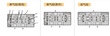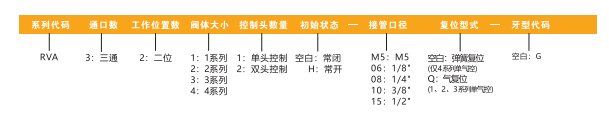 訂貨舉例:RV系列氣控閥,二位三通,2系列閥體,單頭控制,常閉型,接管口徑為1/4,氣復位,G牙,其ERP編碼為:RVA3221-08Q