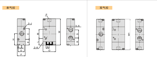 注:常開型和常閉型之安裝和外形尺寸相同,W1*為雙氣控換向閥尺寸。
