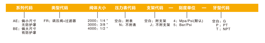 訂貨舉例: A系列調壓閥,2000閥體,附表,附支架,Mpa/Psi刻度單位,PT牙,其ERP編碼為:AER2000-4-P