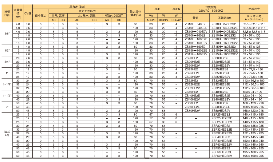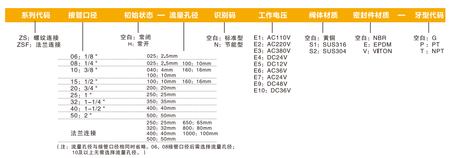 訂貨舉例:ZSH系列電磁閥,接管口徑為1/2,常開型,流量孔徑16mm,標準型,電壓AC110V,閥體材質黃銅,密封件材質為NBR,G牙,其ERP編碼為:ZS15H-160E1