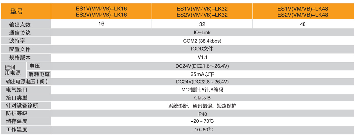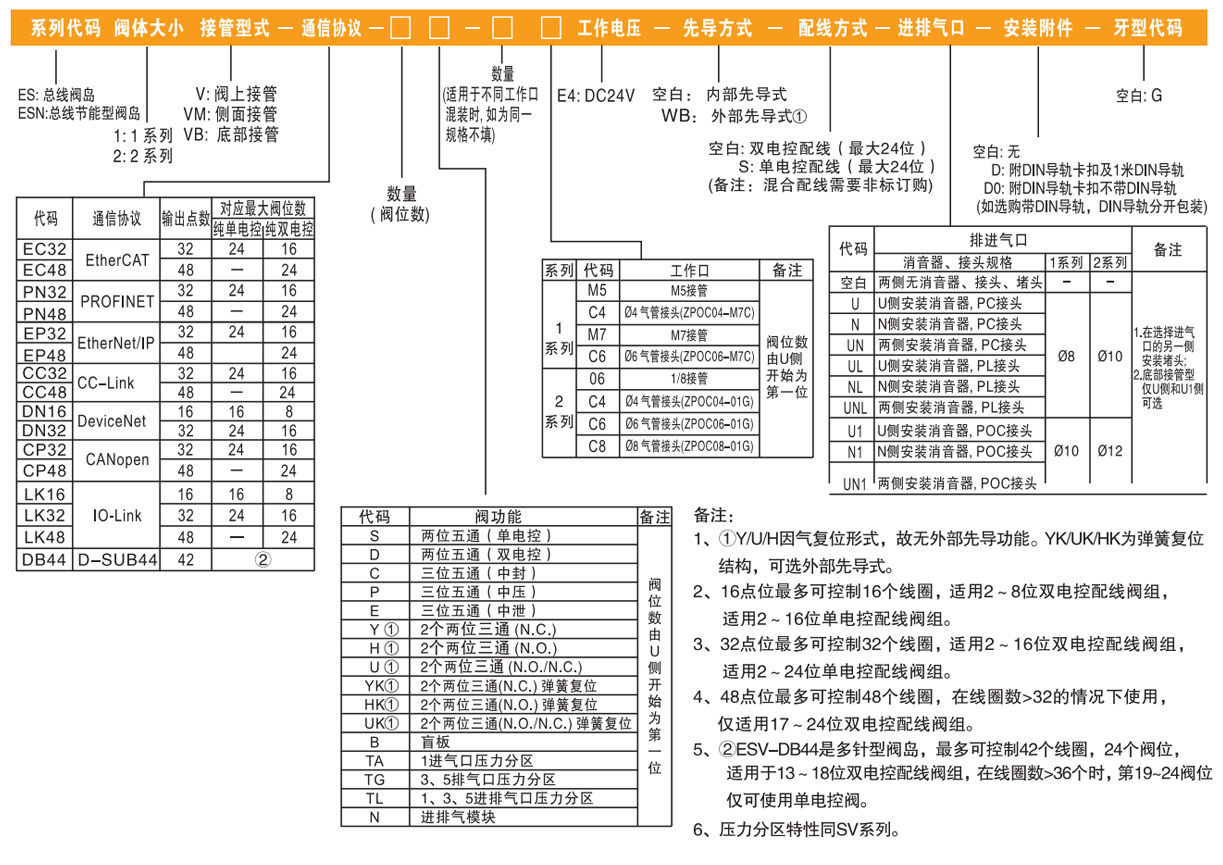 1.同規格閥時:ES系列總線閥島,1系列,閥上接管,PROFINET總線協議,輸出32點,6個兩位五通雙電控電磁閥SV5212,工作口接管口徑均為M5,工作電壓DC24V,內部先導式,配線方式為雙電控配線,進排氣口為兩側無消音器、接頭、堵頭,G牙。