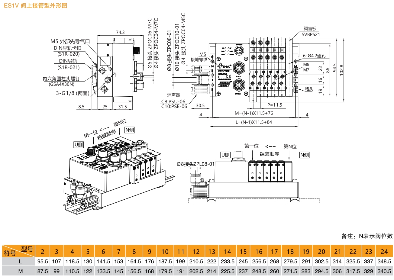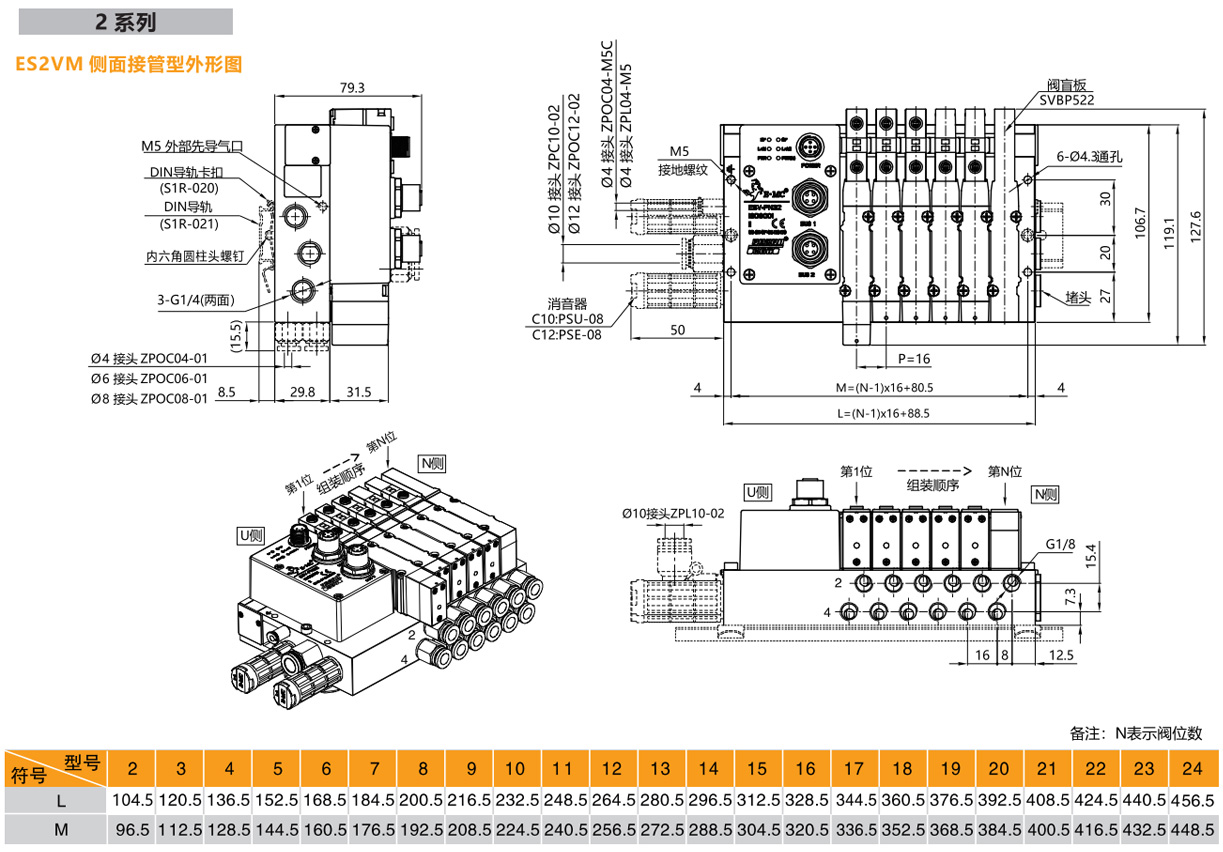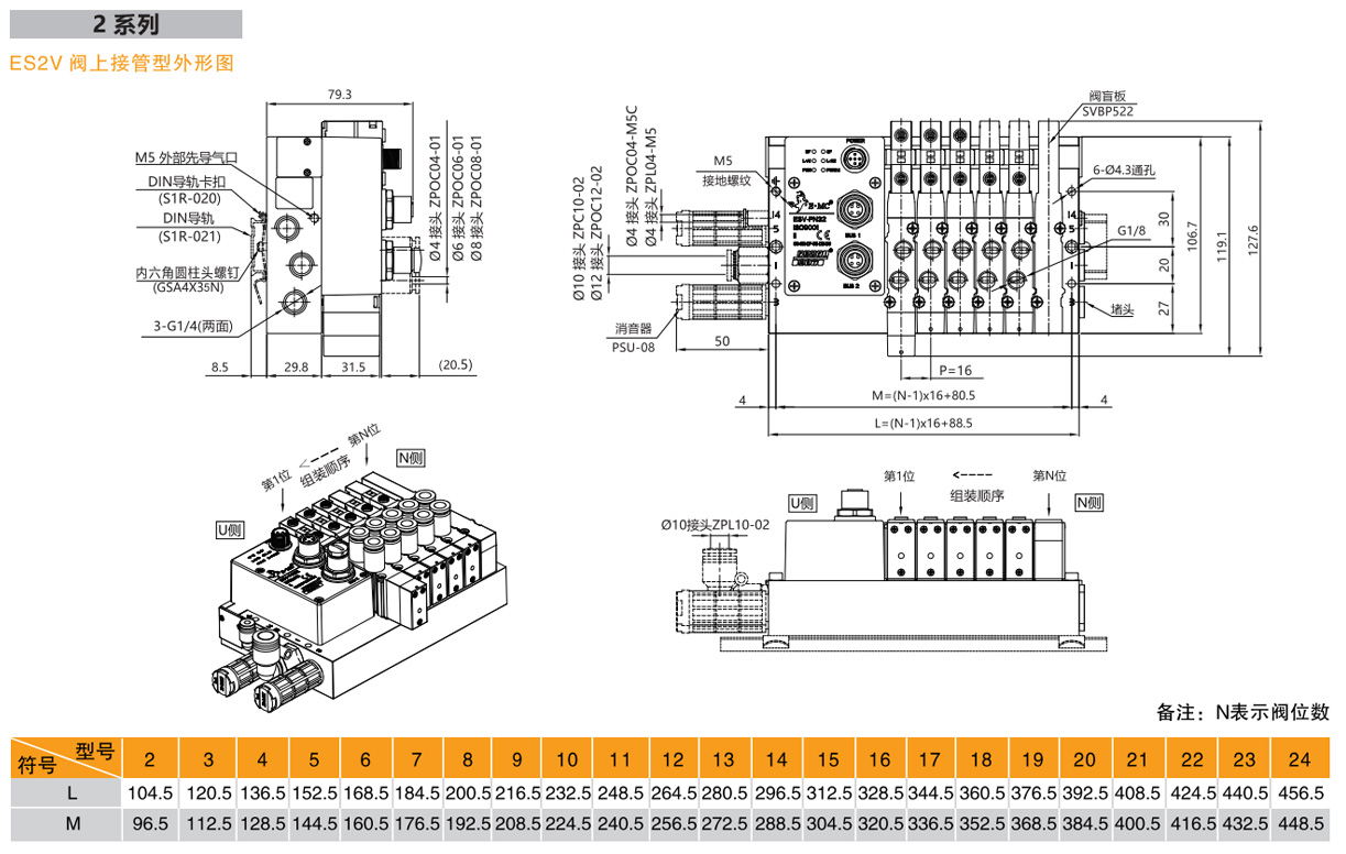 2.不同規格閥混裝時:ES系列總線閥島,1系列,閥上接管,PROFINET總線協議,輸出32點,如右圖所示閥島由第1位為三位五通中封電磁閥SV5312C,第2位為兩位五通雙電控電磁閥SV5212,第3位為2個兩位三通(N.O.)彈簧復位電磁閥SV5412HK,第4、5位為兩位五通單電控電磁閥SV5211,第6位為盲板。第1、2位工作口為?6氣管接頭ZPOC06-M7C,第3至5位工作口均為?4氣管接頭ZPOC04-M7C,工作電壓DC24V,外部先導式,配線方式為雙電控配線,U側安裝消音器、PL接頭?8,安裝DIN導軌卡扣及1米DIN導軌,G牙。