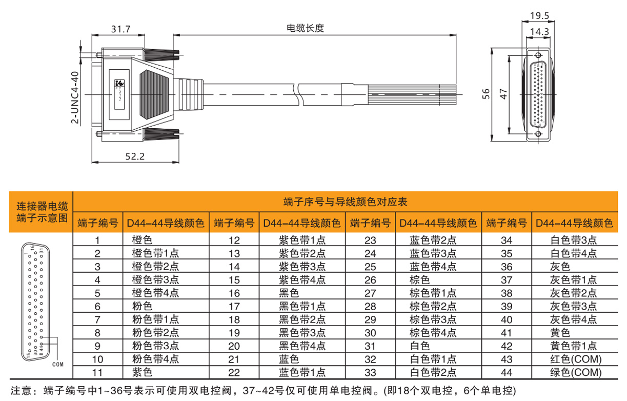 單/雙電控混裝配線示意圖(最多可控制42個線圈,24個閥位,適用于13~18位雙電控配線閥組,在線圈數>36個時,第19~24閥位僅可使用單電控閥;)