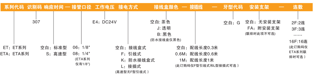 訂貨舉例:ET系列,標準型,接管口徑為1/8",工作電壓為DC24V,接線盒式,茶色,G牙,無安裝支架,其ERP編碼為:ET307-06E4
