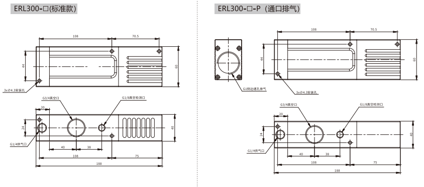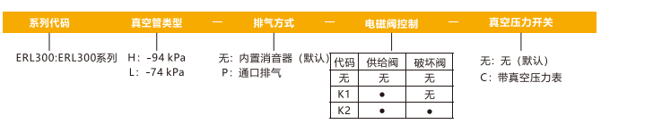 訂貨舉例:ERL300系列真空發(fā)生器,真空管類型:-94kPa;通口排氣,供給閥控制,帶真空壓力表。其訂購碼為:ERL300H-P-K1-C