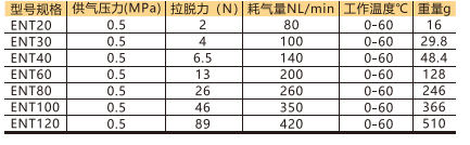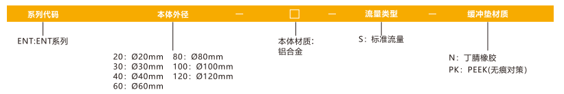 訂貨舉例:ENT系列伯努利發生器真空發生器,本體外徑?20mm,鋁合金材質,標準流量,丁腈橡膠。其訂購碼為:ENT20-□-S-N