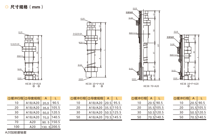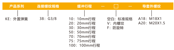 訂貨舉例:KE系列緩沖支桿,連接螺紋規格G3/8,緩沖行程10mm,標準規格,導套外螺紋M18×1其訂購碼為:KE3810-□-A18