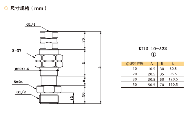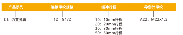 訂貨舉例:KI系列緩沖支桿,連接螺紋規格G1/2,緩沖行程10mm,導套外螺紋M22×1.5其訂購碼為:KI1210-A22