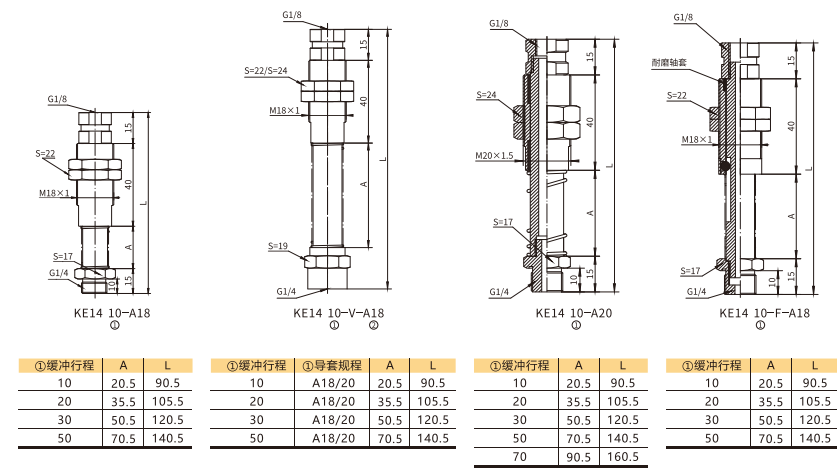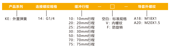 訂貨舉例:KE系列緩沖支桿,連接螺紋規(guī)格G1/4,緩沖行程10mm,標(biāo)準(zhǔn)規(guī)格,導(dǎo)套外螺紋M18×1其訂購(gòu)碼為:KE1410-□-A18