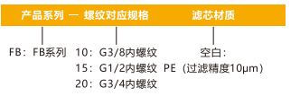 訂貨舉例:FB系列真空過濾器,G3/8內(nèi)螺紋,濾芯材質(zhì)PE。其訂購碼為:FB-10