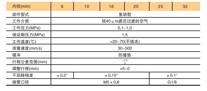 | 內(nèi)徑(mm) | 標(biāo)準行程(mm) | 最大行程(mm) |