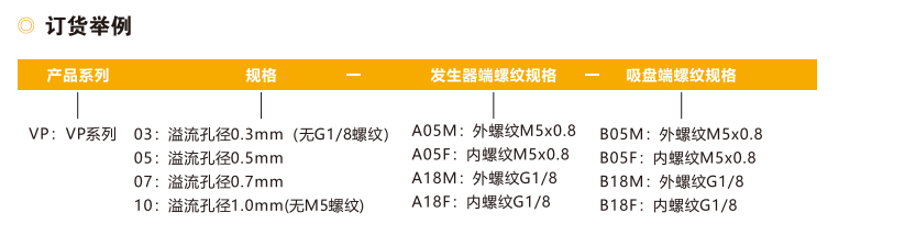 訂貨舉例:VP系列單向閥,溢流孔徑0.3mm(無G1/8螺紋),發生器端外螺紋M5x0.8,吸盤端內螺紋M5x0.8。其訂購碼為:VP03-A05M-B05F