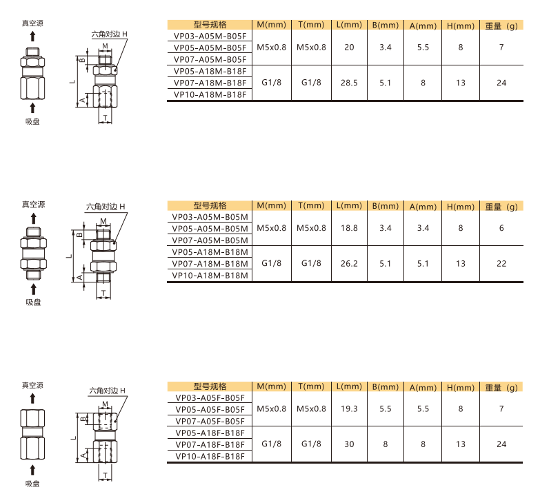 注:產品的兩端螺紋只能選擇同規格,但不限制內外螺紋方式。例如:VP05-A18M-B18F