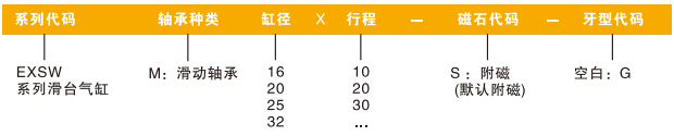 EXSW系列氣缸,軸承種類為滑動(dòng)軸承,缸徑16,行程30,其ERP編碼為: EXSWM16X30-S
