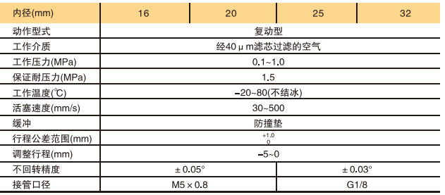 | 內(nèi)徑(mm) | 標(biāo)準(zhǔn)行程(mm) | 最大行程 (mm) |
