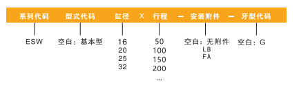 訂貨舉例: ESW系列基本型無桿氣缸,缸徑32,行程50,端蓋牙型為G牙,其ERP編碼為: ESW32X50